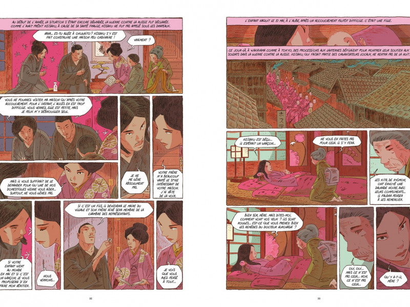 ![]() Plate-forme : Bande Dessinée Date de sortie : 03 Mars 2022 Editeur : Développeur : Genre : Bande dessinée Multijoueur : Non Jouable via Internet : Non Test par Nic0078/10 Scénario et dessin : Cyril Bonin Les dames de Kimoto, Toyono et Hana, se rendent pour la dernière fois ensemble au temple Jison déposer des offrandes. La grand-mère et la petite-fille doivent se séparer car la jeune femme est promise en mariage à l’aîné de la riche famille terrienne des Matani, implantée plus au sud du fleuve Ki. Après une cérémonie nuptiale qui restera dans toutes les mémoires de la province, Hana rejoint le clan de son mari et elle se met à œuvrer subtilement à leur ascension sociale. Avec pudeur, habileté et élégance, Hana façonne son rôle de pilier dans la maison Matani pour devenir une mère de famille modèle dans le respect des traditions et des superstitions profondément ancrées dans son héritage. Mais le kimono traditionnel, l’art des arrangements floraux et la cérémonie du thé ne sont pas au goût de sa fille Fumio. Et sous l’influence occidentale, elle va imposer ses propres choix pour s’émanciper de cette société patriarcale. C’est à la grande déception d’Hana, les chemins de mère et fille prendront des voies différentes. Alors qu’une restera pour œuvrer à la prospérité de leur nom, l’autre partira à la découverte de Tokyo, puis du monde avec son propre clan. Mais peu importe leur propre vision, les drames et la guerre rapprocheront les deux femmes ainsi que la fille de Fumio, Hanako. Les dames de Kimoto est une fresque familiale pleine de douceur et de simplicité qui évoque la transmission dans une société japonaise en pleine mutation du début du XXème à l’après-Seconde Guerre mondiale. Cet ouvrage est une invitation à voyager au cœur du Japon traditionnel où l’auteur met en lumière la discipline des traditions et le pragmatisme de la modernité. Avec une écriture sans fard ni artifice, Les dames de Kimoto est la promesse tenue d’une lecture avisée sur la condition des femmes, voilà ce que nous propose Cyril Bonin pour son nouvel album. Comment ne pas y succomber ? Tiré du roman de Sawako Ariyoshi, vous suivrez la lignée de trois femmes, aussi différentes qu'elles sont pourtant parentes l'une de l'autre. C'est le vol en éclats de cette société, ballottée par l'Histoire, qui forgera ces contrastes et la mue de ces femmes inventant leur rôle nouveau fait d'incompréhensions pour la génération précédente. Sous son trait à l'élégance folle, Cyril s'amuse à dépeindre ces femmes fortes et déterminées, dans des décors aux ornements et couleurs à la fraîcheur printanière. Kimono, ambiances des intérieurs et paysages grandioses, l'image est si juste que l'on est immédiatement transposé au pays du Soleil-Levant. En cette fin d'hiver morose, un tel voyage fait tant de bien que l'on peine à refermer l'album. VERDICT-Vous l'avez compris, "Les dames de Kimoto" est un coup de cœur, ce récit de la condition féminine au Japon est l'un de ces moments de lecture à partager avec un bon thé fumant. |