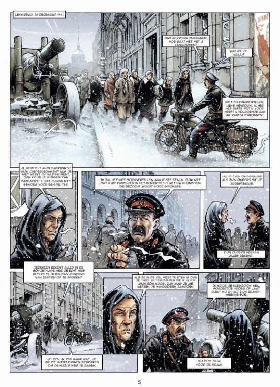 Encore une fois, Jean-Claude Van Rijckeghem et Thomas Du Caju travaillent ensemble sur un projet de bande dessinée autour de la Seconde Guerre mondiale. Cette fois, l'action prend lieu à Leningrad, la ville où les Allemands ont semé la mort et la destruction au cours d'un siège de deux ans et demi, mais qu'ils n'auraient jamais réussi à obtenir. Cette atmosphère sombre donne aussi à l'histoire une profondeur supplémentaire. Ce n'est pas une leçon d'histoire ennuyeuse, mais une véritable histoire d'aventure. Thomas Du Caju nous fait revivre des scènes de guerre dynamiques et riches en action, tout en n'omettant pas d'inclure des filles attrayantes.