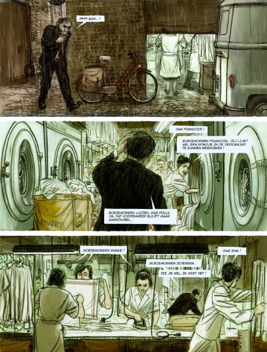 Quiconque a lu Béatrice, les débuts fracassants de l'illustrateur flamand Joris Mertens, sait de quoi il retourne. Il peut dessiner des paysages urbains comme personne d'autre ; de magnifiques panoramas de villes avec la grandeur fanée de la fin des années cinquante et des années soixante, de préférence sous un angle en hauteur, avec des rues et des places pleines de lettres publicitaires et d'architecture classique. Mertens a laissé le lecteur se promener dans des quartiers au chic piquant, l'a laissé entrer dans de grands cafés délicieux où le temps s'est arrêté - et il a également réussi à ajouter une belle histoire sans texte. Trois ans après Béatrice, Mertens est de retour, cette fois avec un roman graphique avec texte. Dans Nettoyage à sec (Bleekwater), il opte à nouveau pour une grande ville comme décor. Le personnage principal est François conduit tous les jours les livraisons d'une entreprise de nettoyage à sec. Avec une camionnette, dans une métropole délabrée où il pleut sans cesse depuis quelques semaines, sans grande perspective d'une journée ensoleillée. Nettoyage à sec est un livre profondément belge, dans lequel la couleur locale et les dialogues sont parfaitement équilibrés. François est un personnage. Il semble toujours être en mouvement dans la vie, il a quelque chose d'une agitation constante. Les rares fois où nous le voyons avec une expression amicale, c'est lorsqu'il rêve à voix haute de gagner au loto. Il a joué à la loterie pendant la moitié de sa vie, toujours avec la même rangée de chiffres, et il est sûr qu'un jour le bien lui reviendra. Puis il achètera une petite maison pour la kiosquière Maryvonne et sa petite fille, que François adore.