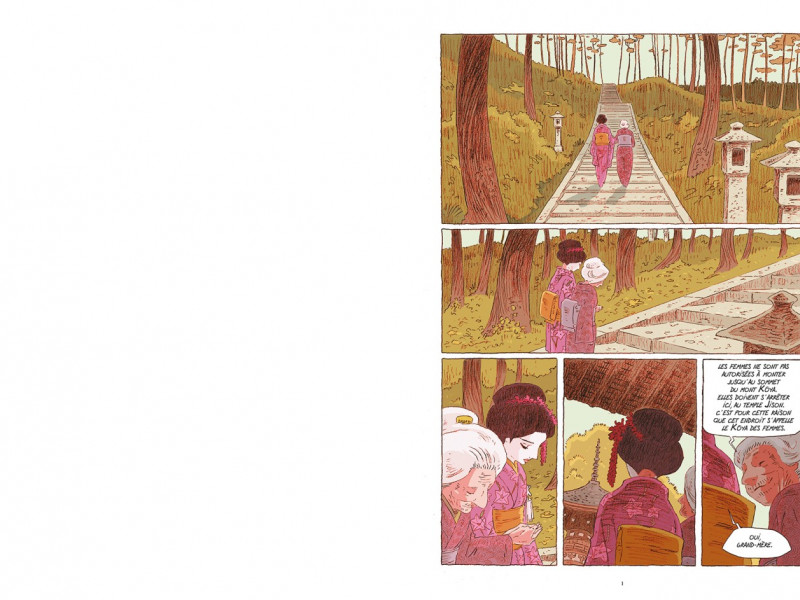 ![]() Plate-forme : Bande Dessinée Date de sortie : 03 Mars 2022 Editeur : Développeur : Genre : Bande dessinée Multijoueur : Non Jouable via Internet : Non Test par Nic0078/10 Scénario et dessin : Cyril Bonin Les dames de Kimoto, Toyono et Hana, se rendent pour la dernière fois ensemble au temple Jison déposer des offrandes. La grand-mère et la petite-fille doivent se séparer car la jeune femme est promise en mariage à l’aîné de la riche famille terrienne des Matani, implantée plus au sud du fleuve Ki. Après une cérémonie nuptiale qui restera dans toutes les mémoires de la province, Hana rejoint le clan de son mari et elle se met à œuvrer subtilement à leur ascension sociale. Avec pudeur, habileté et élégance, Hana façonne son rôle de pilier dans la maison Matani pour devenir une mère de famille modèle dans le respect des traditions et des superstitions profondément ancrées dans son héritage. Mais le kimono traditionnel, l’art des arrangements floraux et la cérémonie du thé ne sont pas au goût de sa fille Fumio. Et sous l’influence occidentale, elle va imposer ses propres choix pour s’émanciper de cette société patriarcale. C’est à la grande déception d’Hana, les chemins de mère et fille prendront des voies différentes. Alors qu’une restera pour œuvrer à la prospérité de leur nom, l’autre partira à la découverte de Tokyo, puis du monde avec son propre clan. Mais peu importe leur propre vision, les drames et la guerre rapprocheront les deux femmes ainsi que la fille de Fumio, Hanako. Les dames de Kimoto est une fresque familiale pleine de douceur et de simplicité qui évoque la transmission dans une société japonaise en pleine mutation du début du XXème à l’après-Seconde Guerre mondiale. Cet ouvrage est une invitation à voyager au cœur du Japon traditionnel où l’auteur met en lumière la discipline des traditions et le pragmatisme de la modernité. Avec une écriture sans fard ni artifice, Les dames de Kimoto est la promesse tenue d’une lecture avisée sur la condition des femmes, voilà ce que nous propose Cyril Bonin pour son nouvel album. Comment ne pas y succomber ? Tiré du roman de Sawako Ariyoshi, vous suivrez la lignée de trois femmes, aussi différentes qu'elles sont pourtant parentes l'une de l'autre. C'est le vol en éclats de cette société, ballottée par l'Histoire, qui forgera ces contrastes et la mue de ces femmes inventant leur rôle nouveau fait d'incompréhensions pour la génération précédente. Sous son trait à l'élégance folle, Cyril s'amuse à dépeindre ces femmes fortes et déterminées, dans des décors aux ornements et couleurs à la fraîcheur printanière. Kimono, ambiances des intérieurs et paysages grandioses, l'image est si juste que l'on est immédiatement transposé au pays du Soleil-Levant. En cette fin d'hiver morose, un tel voyage fait tant de bien que l'on peine à refermer l'album. VERDICT-Vous l'avez compris, "Les dames de Kimoto" est un coup de cœur, ce récit de la condition féminine au Japon est l'un de ces moments de lecture à partager avec un bon thé fumant. |