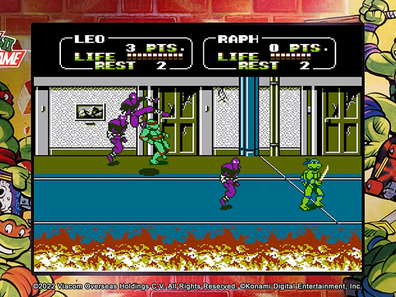 C'est un retour direct à l'arcade avec le stupéfiant Turtles in Time (1991), une suite entièrement améliorée qui arrive plus ou moins directement sur les consoles : la Super Famicom a droit à une adaptation très similaire mais avec quelques différences importantes, tandis que l'année suivante, la Megadrive accueille les tortues qui l'avaient snobée jusque-là avec The Hyperstone Heist, une sorte de remix de l'original. Pour couronner le tout, il y a les trois versions (NES, Super Famicom et Megadrive) de Tournament Fighters, où les tortues et leurs ennemis bizarres se retrouvent embarqués dans l'obligatoire jeu de combat compétitif sans lequel vous n'étiez vraiment personne dans les années 90. Boulier en main, c'est parti : treize titres, à jouer avec pas mal de commodités modernes telles que la sauvegarde de position, la possibilité de rembobiner l'action, pas moins de trois filtres pour singer les vieux tubes cathodiques, et même le jeu en ligne pour quatre d'entre eux, à savoir les deux coin-ops, The Hyperstone Heist et la version SNES de Tournament Fighters. L'émulation des treize titres proposés est réalisée de main de maître : tout fonctionne de manière fluide et propre, les sprites sont bien définis, bien animés, il n'y a aucun décalage au niveau des commandes et même le son est reproduit de manière impeccable.